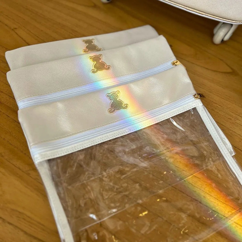 Peças em emborrachado Branco Perolado, detalhes no tecido emborrachado na cor ouro, bordado de ursinho, metais inoxidáveis banhados a ouro e forro impermeável.