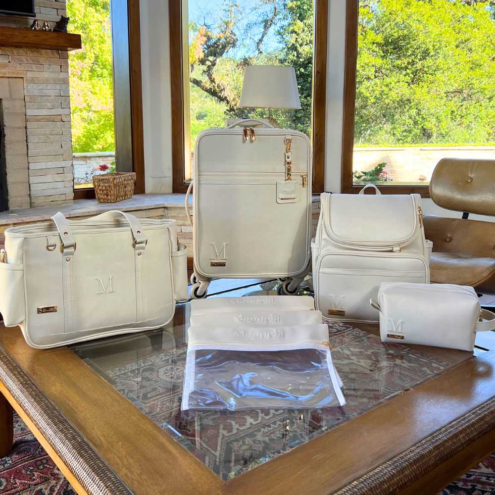 Peças em couro bege, detalhes personalizados em todas as peças, metais inoxidáveis banhados a ouro e forro impermeável.